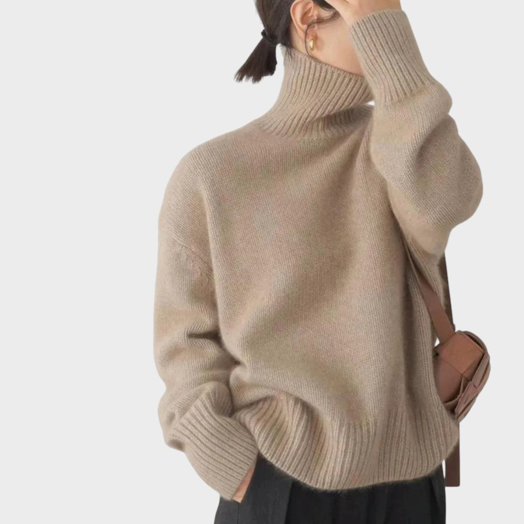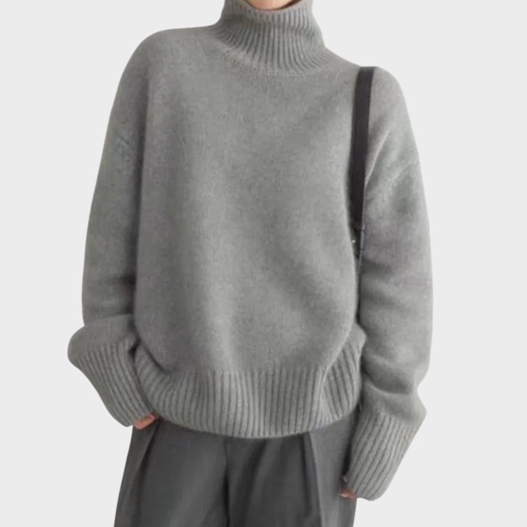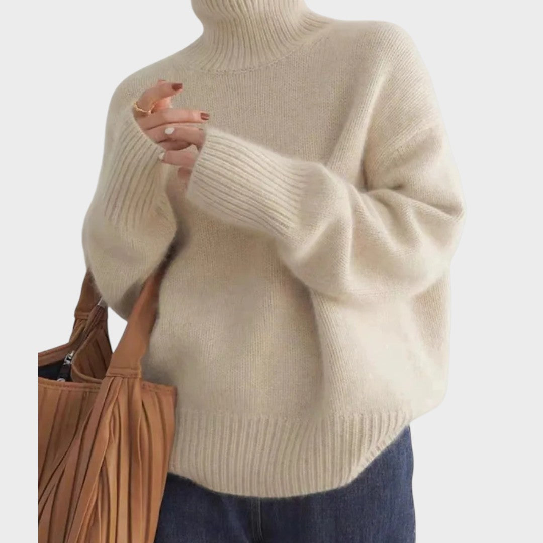 Šiltas, švelnaus prisilietimo megztinis su aukštu kaklu ir nugulusiais pečiais. Laisvas, bet dailiai krentantis siluetas nevaržo judesių, o platūs, elastingi rankogaliai ir apačia patikimai laiko formą. Idealiai tinka sluoksniuoti su marškiniais ar vilkėti vieną – nuo biuro iki savaitgalio išvykų.