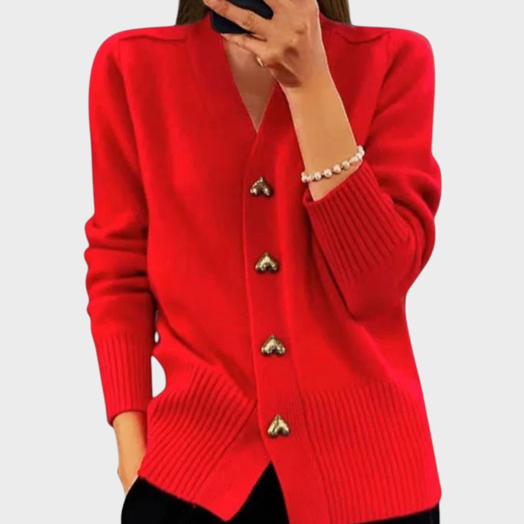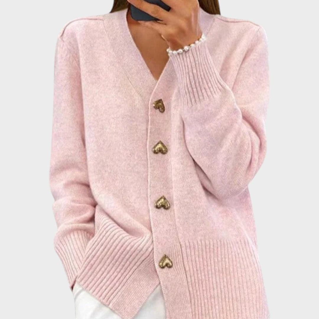 Elegantiškas kardiganas su širdelės formos sagomis – stilius ir komfortas viename