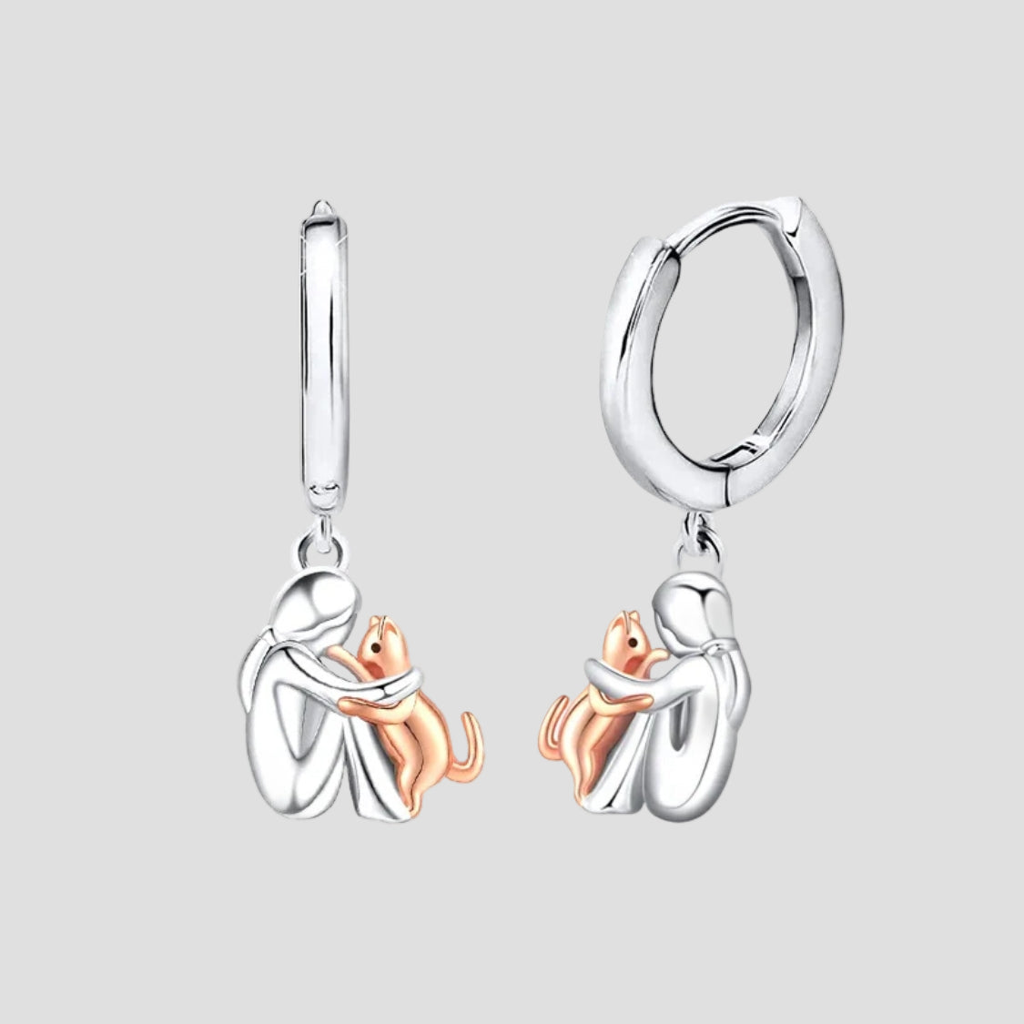 Užfiksuokite tyrą meilės džiaugsmą su šiais išskirtiniais auskarais, kuriuose pavaizduota mergina, glostanti savo katę. Pagaminti iš blizgančio sidabro su prabangia rožinio aukso apdaila, šie auskarai švenčia ypatingą ryšį su jūsų kailiniu draugu.